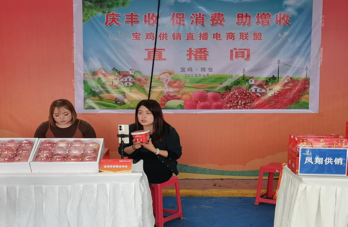 秋分时节,五谷丰登。为隆重庆祝宝鸡市2025年中国农民丰收节,进一步拓宽农产品销售渠道,激发城乡消费潜能,9月25日,宝鸡市供销社组织参加了“庆丰收·促消费·促增收”供销直播电商联盟直播带货活动,在陈仓区绿丰源省级现代农业示范园举行。凤翔区供销联社积极响应、精心组织,通过“线下展销+线上直播”双渠道模式,全面推广凤翔优质农产品。