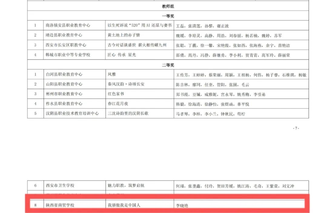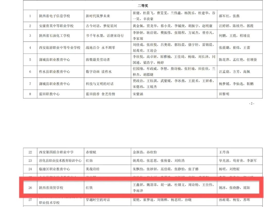 近日,由陕西省教育科学研究院主办的2025年中等职业学校 “爱我中华 魅力职教”经典诵读活动评选结果正式揭晓。我校师生表现突出,成绩优异,教师组、学生组作品双双获奖。由姚冰、张晓静、屈阳老师指导,王鑫妍、魏羽菲、胡一涵、杜锦文、周诗梅、王佳伟、李雨泽七名同学共同演绎的作品《红铁》荣获学生组二等奖;李晓艳老师的参赛作品《我骄傲我是中国人》荣获教师组二等奖。